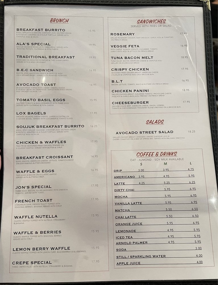 Three eggs, bacon, sliced avocado, fresh tomato and feta cheese. Served with sourdough toast.